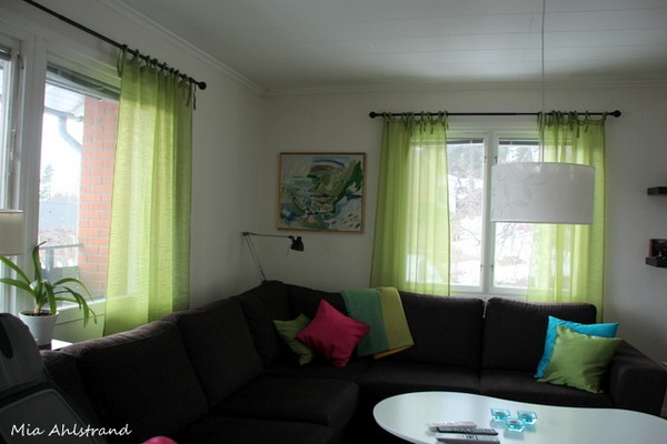 Vi passade på att ta bort allt det röda i vardagsrummet och byta till vårfärger på gardiner, kuddar, matta, ljusstakar etc. Då passade ju denna tavla perfekt till allt annat lime och turkost.