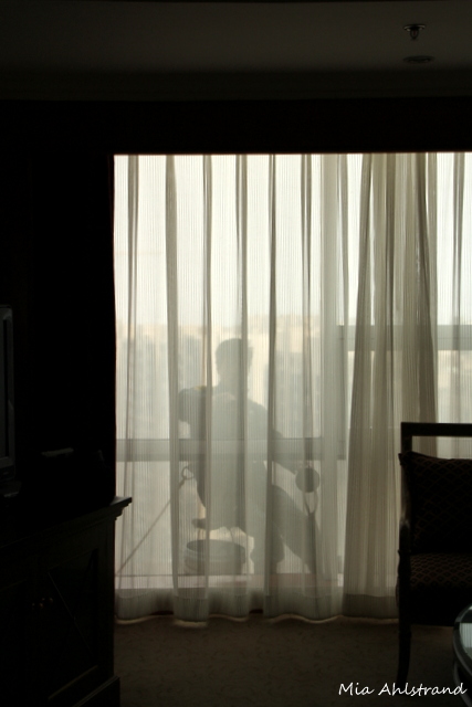 Igår på morgonen såg jag ett tjockt rep hänga utanför fönstret. Sen på eftermiddagen dunsade det till och så dök en hängande fönsterputsare upp, på 33:e våningen, dinglande i repet… De har nog inga kollektivavtal och skyddsombud här 🙂