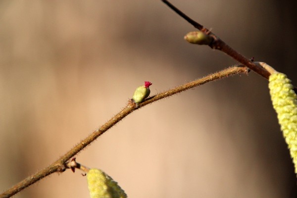 Härligt promenadväder i helgen, och även i dag. Visst är hasselns honblommor så diskreta. Det är hanblommorna som är hängena.