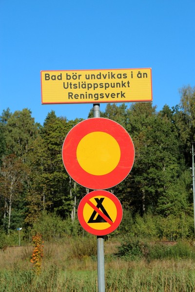 Nu är det inte så stor risk att någon härifrån skulle bada i ån eftersom reningsverket ligger där, men skulle det nu komma någon utsocknes så kan ju en skylt vara bra.