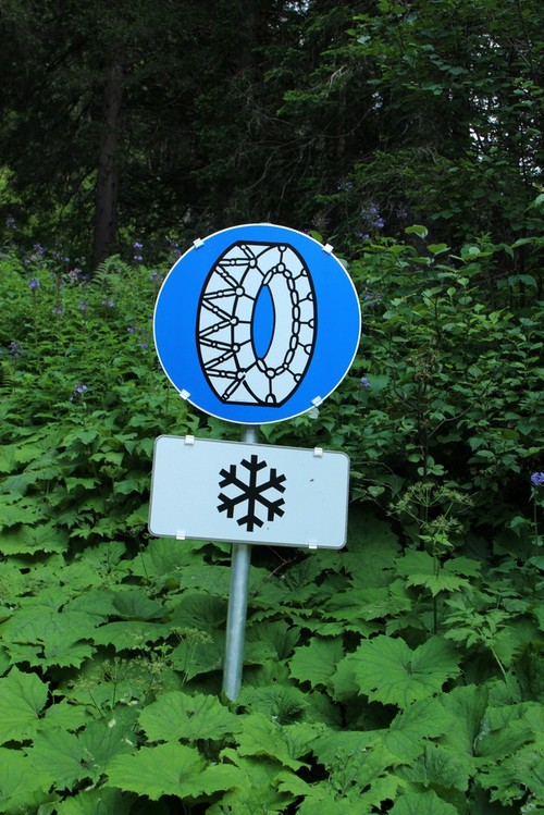 Åsså till skyltarna: snöskedjor har jag då aldrig sett i Sverige, men väl i alperna, vilket ju är konstigt. För visst borde dubbdäck eller vinterdäck räcka där också. Ja, förutsatt att snöröjningen där fungerar lika bra där som i Sverige då…