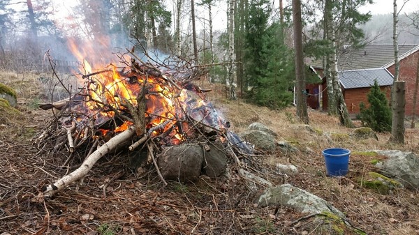 Eftersom vi har en allmänning ovanför vår tomtgräns lägger både vi och andra grannar massa ris och trädgårdsavfall där. När barnen var mindre eldade vi en gång om året men nu blir det nog bara var tredje år. Bergen av ris och pinnar växer och växer.