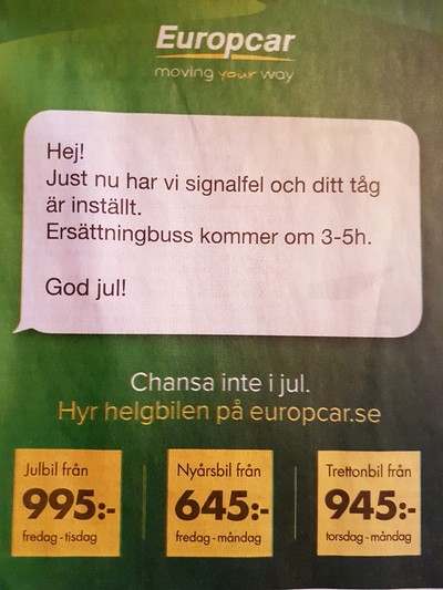 Å du – ingen av dom har jag sett här i 08, tror det eller ej, å då gick jag ändå förbi Pressbyrån i Täby Centrum idag… Skylten är otroligt fyndig liksom den för Europcar, som dessutom är ofta sant, speciellt med tanke på pendeltågens pålitlighet.