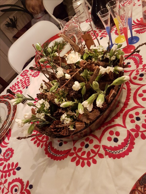 Varför är vi så många som fått en knasig jul när det ska vara frid och mys. Fast ditt julbord ser härligt välkomnande och fint ut. Så ursnyggt med arrangemanget av kottar, pinnar och blommor!