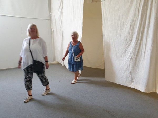 Efter det åkte vi till Skeppsta Hytta och där hade de ocksås en konstutställning. Vi blev visade in bland en massa hängande lakan. Man fick gå som i en labyrint mellan lakana och här och där stod strålkastare och rökmaskiner. När kommer vi till själva utställningen undrade vi? Men det visade sig att det var lakana som var själva utställningen. Väldigt skumt!!