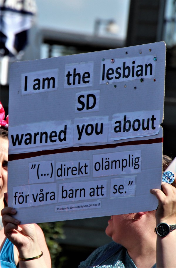 Vilken toppenskyltning! Och roligt att Gnesta hade sin egen Prideparad. Jag läste om den och bra att det sprids. Jag kände igen den här SD skylten från Prideparaden här i Stockholm i augusti.