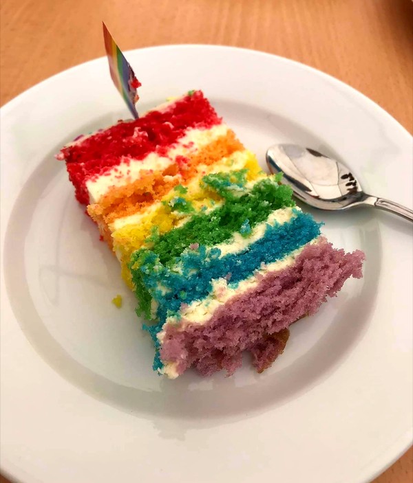 Vilka härliga regnbågsfärger, Skylten som tjejen håller upp var rolig och kakan hade varit kul att testa.