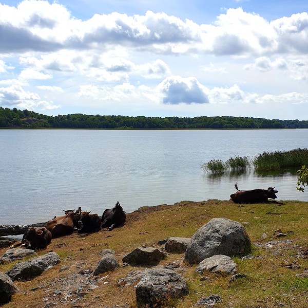 Längst ut på en udde slog vi oss ner och åt vår matsäck. Där hade vi sällskap av kossorna.