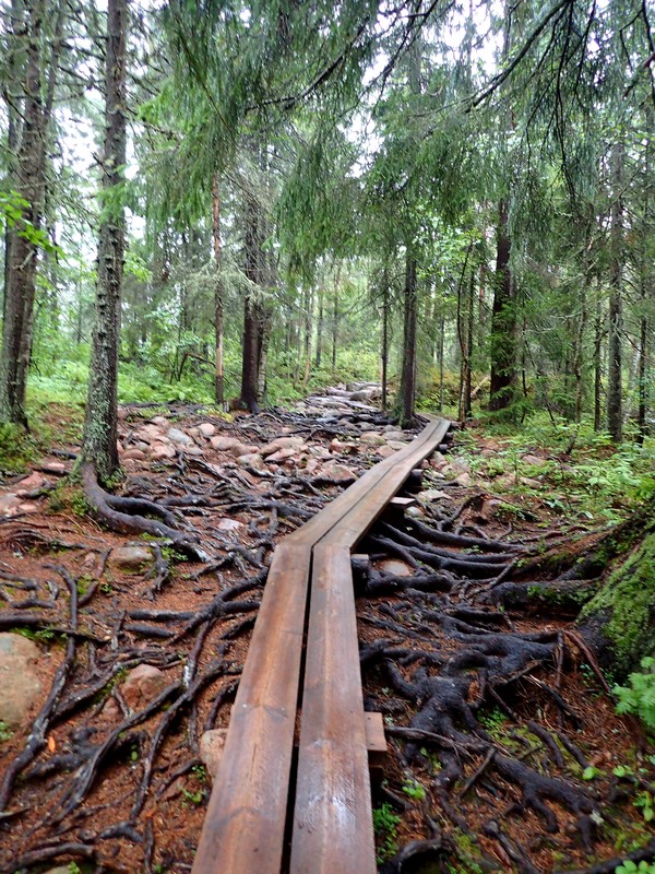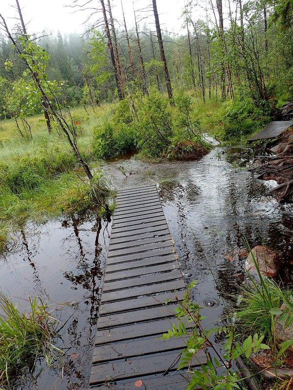 När man traskade över denna spång sjönk den ner under vattnet och vi var glada att vi hade vandringskängorna på. Ett annat par vi träffade på där fick ta en omväg för att ta sig förbi en bit bort.