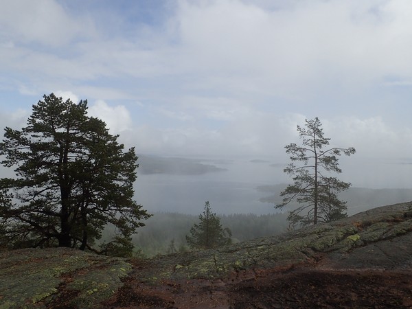 Vandrade vidare. Här är vi högt uppe på ett berg och man kan skymta havet genom dimman.