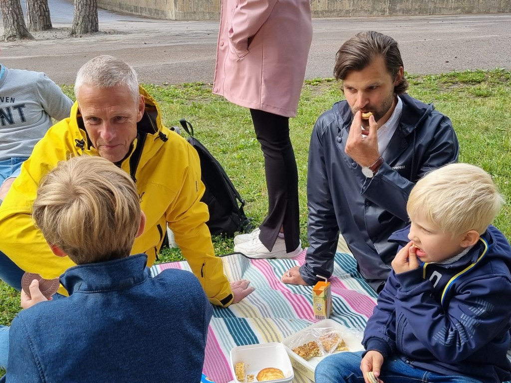 Årets skolavslutning skedde utomhus som vanligt men i år lyste solen med sin frånvaro. Det regnade lite till och från men var mestadels uppehåll som tur var. Man får inte lägga upp några foton från själva sången med alla barn, men Charles ville ju vara avslutningsfin och stod och huttrade i kortärmad skjorta. Vid fikat tog han på sig en jacka i alla fall.