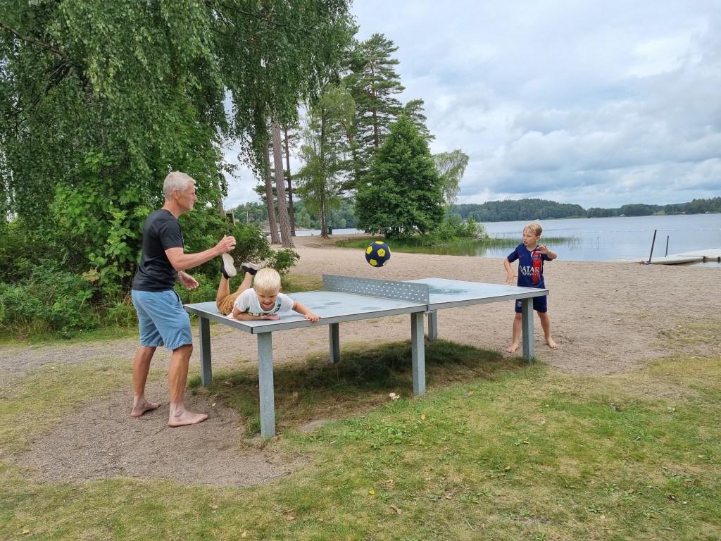 Och Trulsfeber som det blev, så ville Charles spela pingis, men vi hade bara fotboll med oss så det blev lite specialregler och lillebror la sig på bordet 🙂 Nu har killarna fått nät och pingisrack av oss så de kan spela pingis på riktigt.