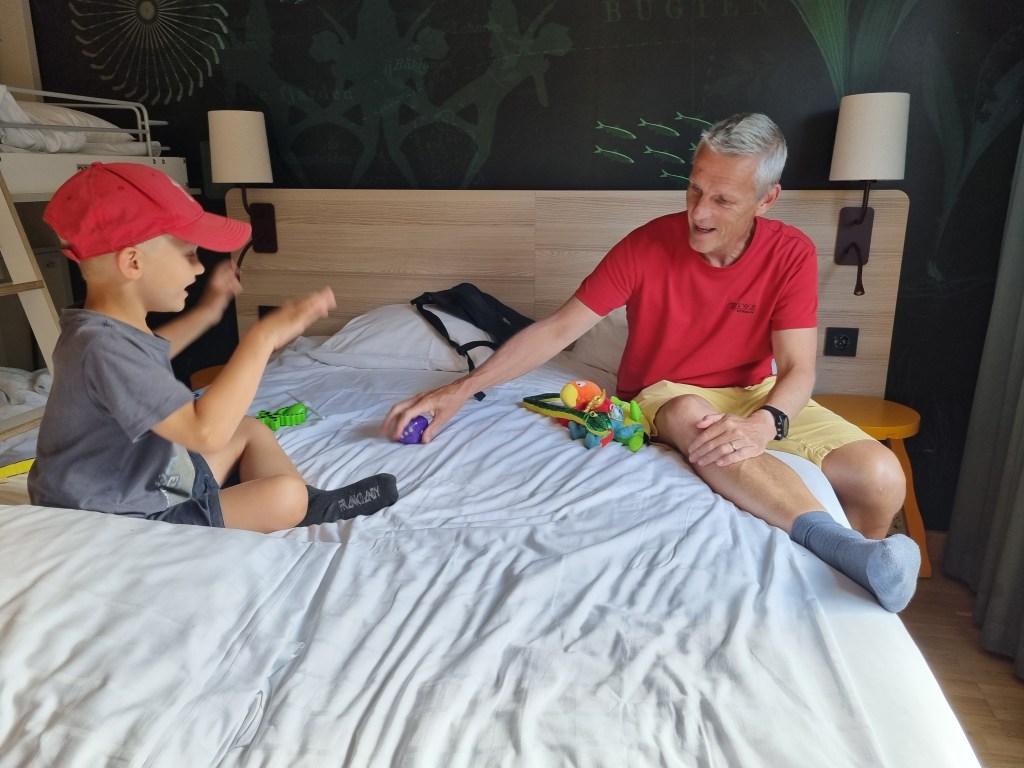 Vi bodde på Scandic i Gävle och här visar Oliver alla små gosedjur han har packat med sig.